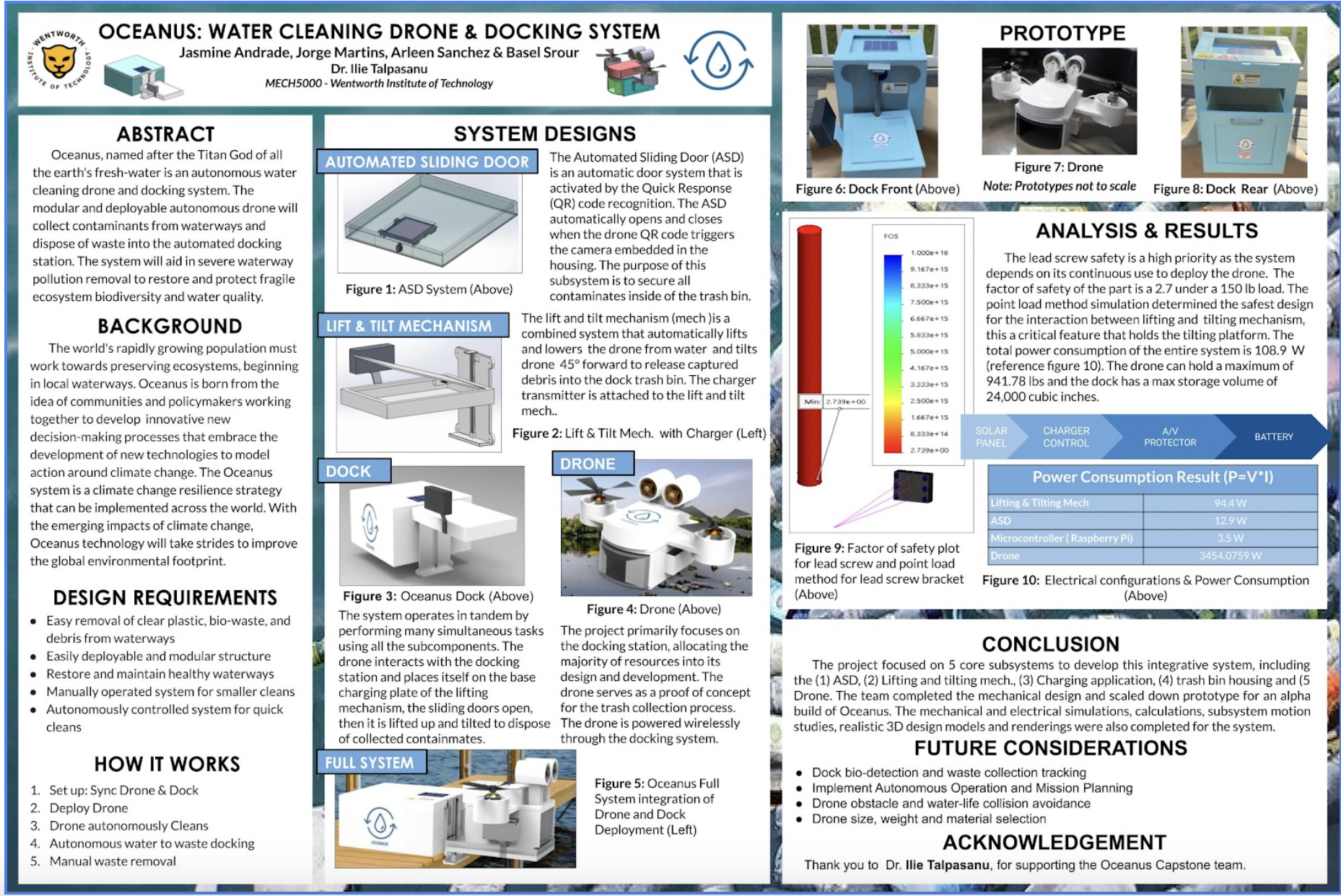 This autonomous cleaning drone and docking system will collect contaminates from waterways and depose them into an automated docking system. The drone aims to aid in severe waterway pollution in order to restore and protect fragile ecosystems biodiversity, water quality, and climate change resilience across the world. This project investigates existing drone cleaning concepts, product design, additive manufacturing, mechanical design, analysis and simulation, robotics, climate change, and sustainability in order to develop a fully integrative system. The full system includes several subsystems including a lifting mechanism, tilting mechanism, automated sliding door, charging application, trash bin, and drone that work synchronistically to restore waterways. Throughout this research, the team investigates the best design approaches and applications to develop an easily modular and deployable system.